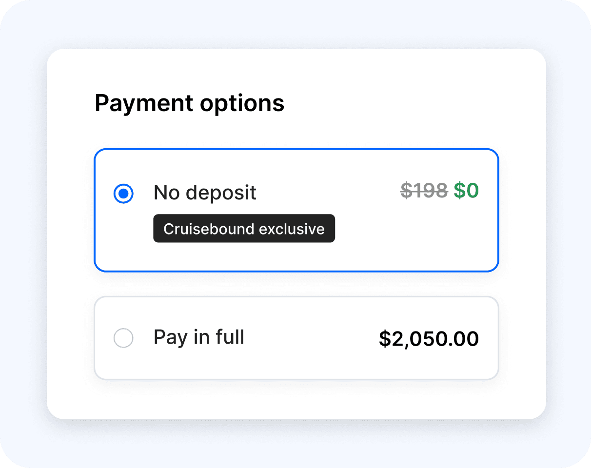 Book now, pay laterLock in the price on thousands of eligible sailings, no deposit required, all with a free Cruisebound account.